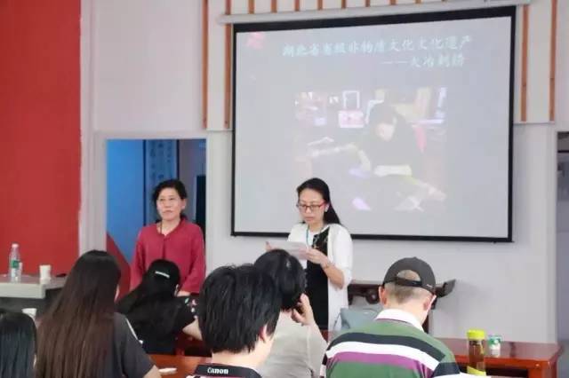 這天,尹國(guó)安主講《中國(guó)民間藝術(shù)之大冶石雕》、劉小紅主講《大冶刺繡的民俗文化》,與學(xué)生們一起分享了這兩項(xiàng)非遺項(xiàng)目中蘊(yùn)含的民俗文化。兩堂課講下來(lái)學(xué)生們都聽得相當(dāng)認(rèn)真,反響十分熱烈。